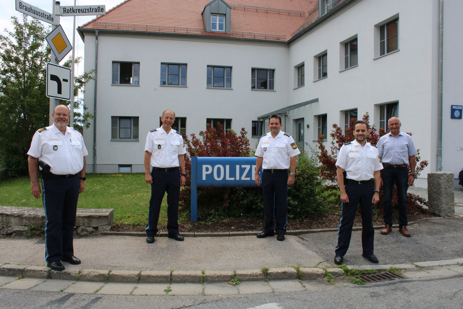 v.l.n.r.: Polizeipräsident Norbert Zink, PHK Wolfgang Eichenseer (stv. Dienststellenleiter), EPHK Karlheinz Dietl, KHK Dmitri Schreiber, Personalrat Franz Eichenseher