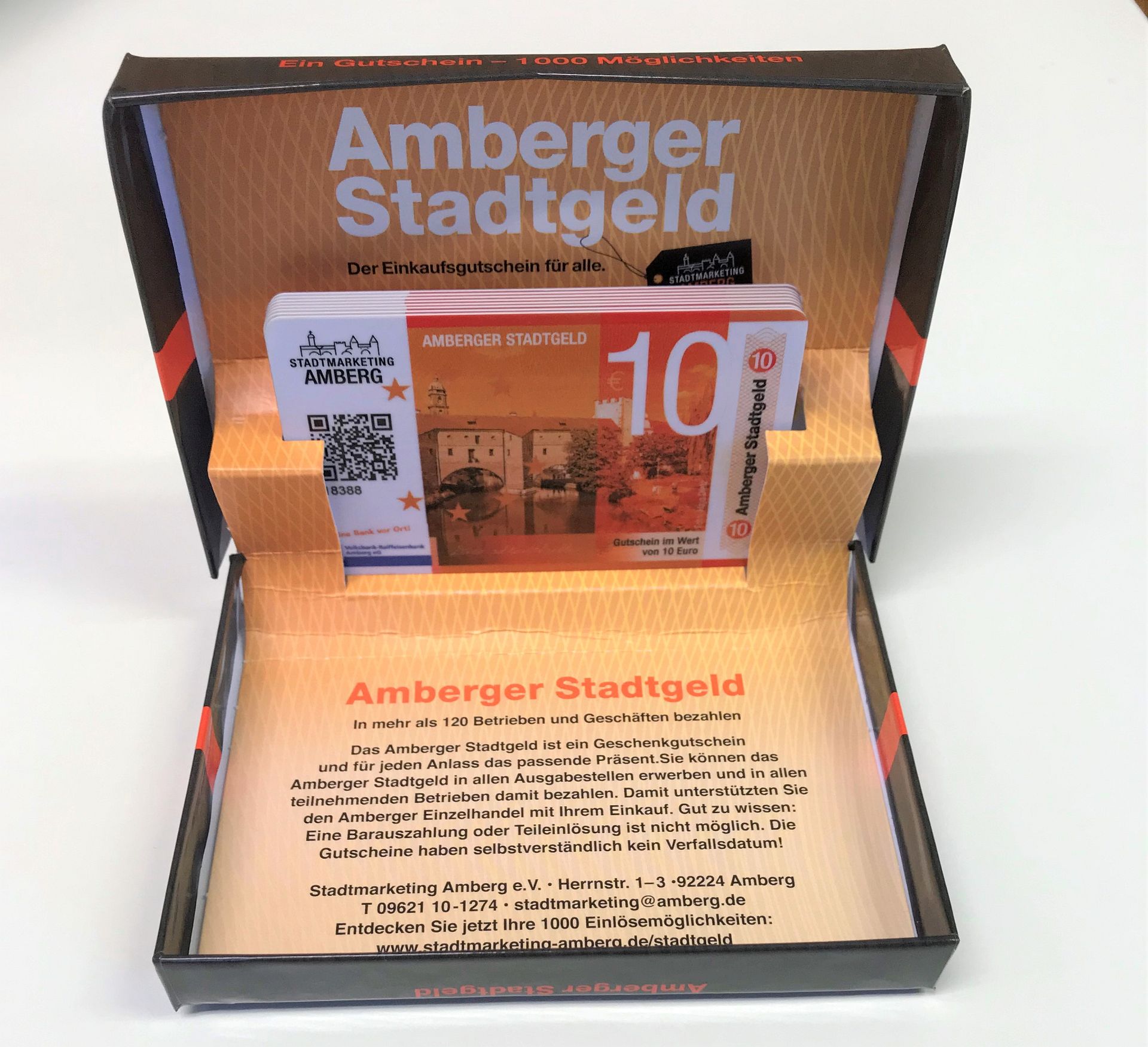 Der 40€ Gutschein, der neben dem gewohnten 10er seit diesem Jahr erhältlich ist, hat den Umsatz nochmal deutlich angekurbelt. Im Weihnachtsgeschäft sind zurzeit laut Ina Bogner vom Stadtmarketingverein deutlich mehr Gutscheine im Umlauf als gewöhnlich, nämlich knapp 20.000 Stück. Der neueste Clou sind die kleinen Geschenkboxen, in denen das Stadtgeld hübsch und praktisch verpackt ist. Alle Annahme- und Ausgabestellen findet man auf dem Flyer oder im Netz unter www.stadtmarketing-amberg.de/stadtgeld/