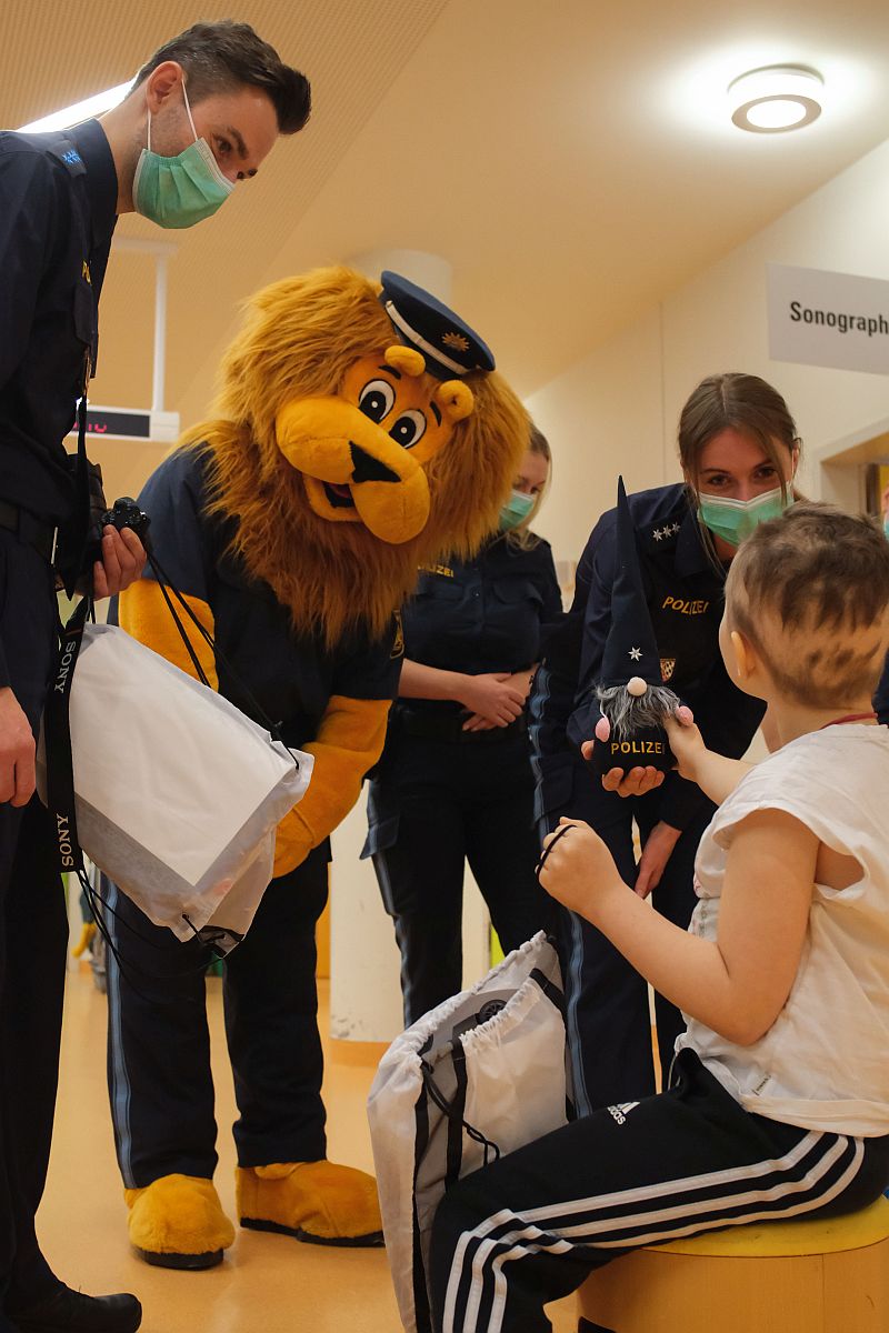 Am Dienstagnachmittag durften sich die Kinder der Kinderklinik über einen Weihnachtsbesuch der Polizei freuen. Beim Betreten der Stationen wurden die Beamtinnen und Beamten bereits freudig erwartet. Zum Staunen brachte zweifelsfrei das sympathische Maskottchen, der Polizeilöwe „Lexi“, der viele Geschenke für die kleinen Patienten dabei hatte. Da Lexi weiß, wie tapfer die Kinder der Kinderklinik sind bzw. sein müssen, erhielt jedes Kind, passend zur Weihnachtszeit einen eigene Polizeiwichtel, als persönlichen Beschützer. Der Wichtel soll ein Symbol der Freude und Hoffnung sein, auf jedes Kind aufpassen und in schwierigen Zeiten Kraft spenden. Zudem hatte Lexi für jedes Kind eine Geschenktasche mit Bastelbögen, Polizeikelle, Spitzer, Lineal und Bleistift dabei. Mit einem strahlenden Lächeln nahm jedes Kind die Geschenke freudig an. Einige nutzten sofort die Gelegenheit und bastelten sich zusammen mit ihren Eltern eine eigene Polizeimütze und das Polizeiauto.